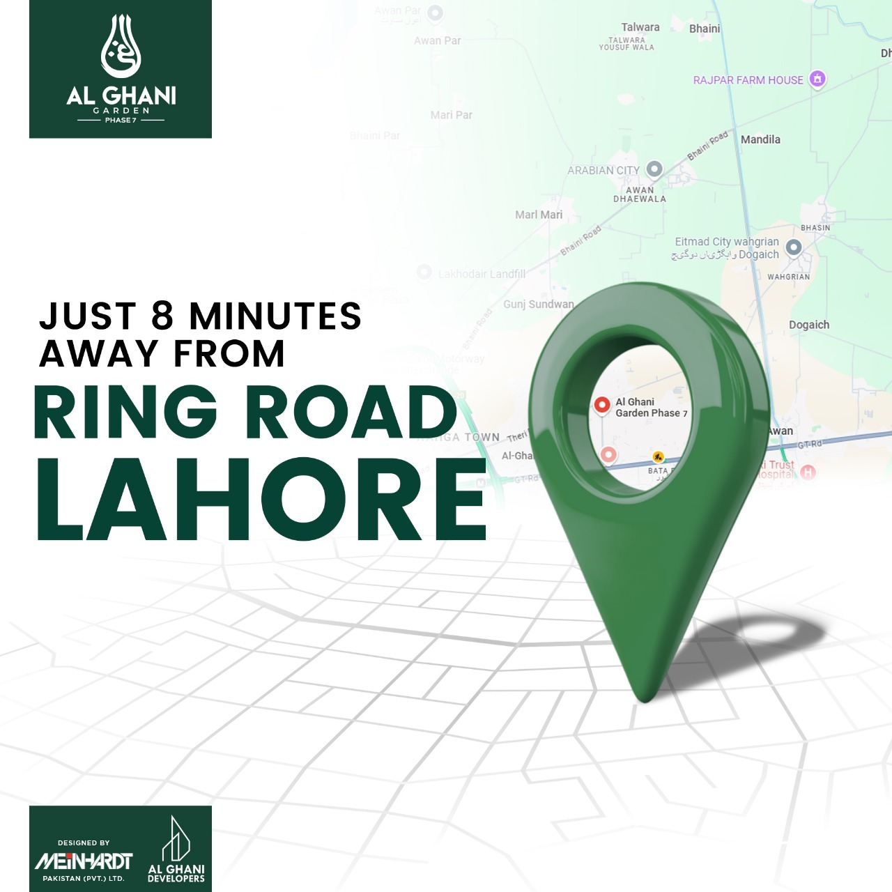 Al Ghani Garden Phase 7, a grand housing initiative by Al Ghani Developers, is now officially approved by the Town Municipal Administration (TMA) approval number LGU50/64 , presenting an outstanding investment opportunity in Lahore’s real estate market with plots available on convenient installment plans. Located at the prime site of Bhaini Road, and easily accessible from both Ring Road and GT Road, this development offers unparalleled convenience and connectivity. Residents will benefit from seamless access to major transportation networks, including the Orange Line Train, Metro Bus Service, and Lahore Airport, ensuring effortless commuting and travel.